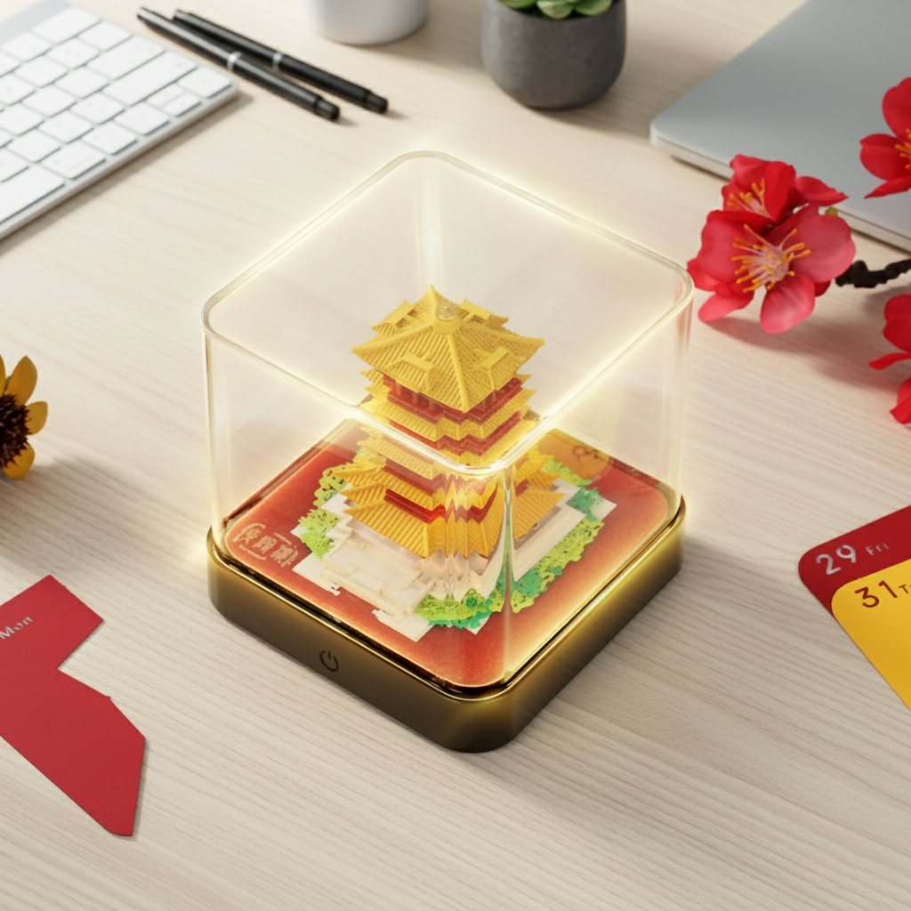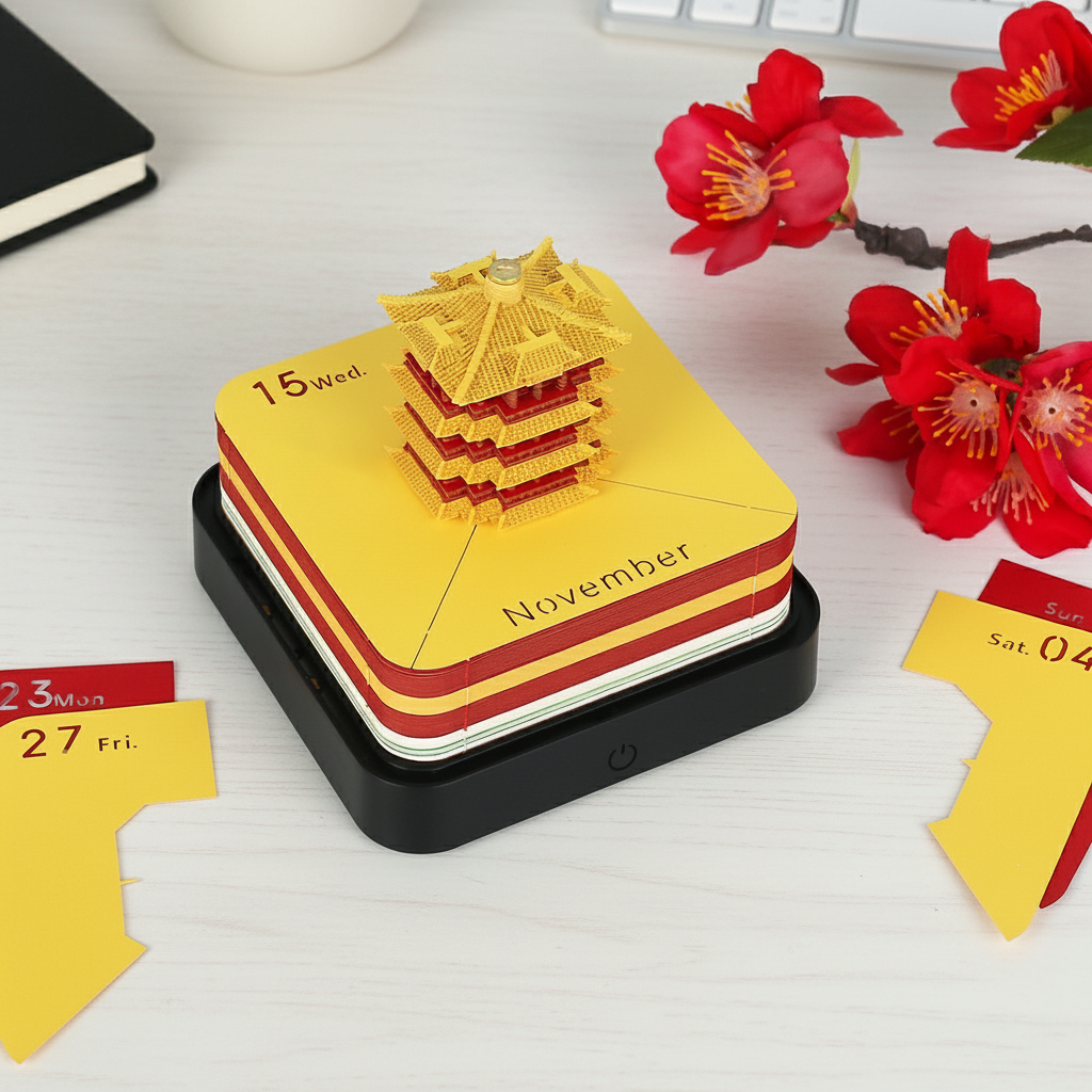 As each page turns, the Yellow Crane Tower slowly takes shape in delicate layers, capturing its timeless elegance in 3D. Soft lighting from below adds a warm glow and a sense of depth, turning this calendar into a gentle centerpiece that’s as calming as it is impressive.